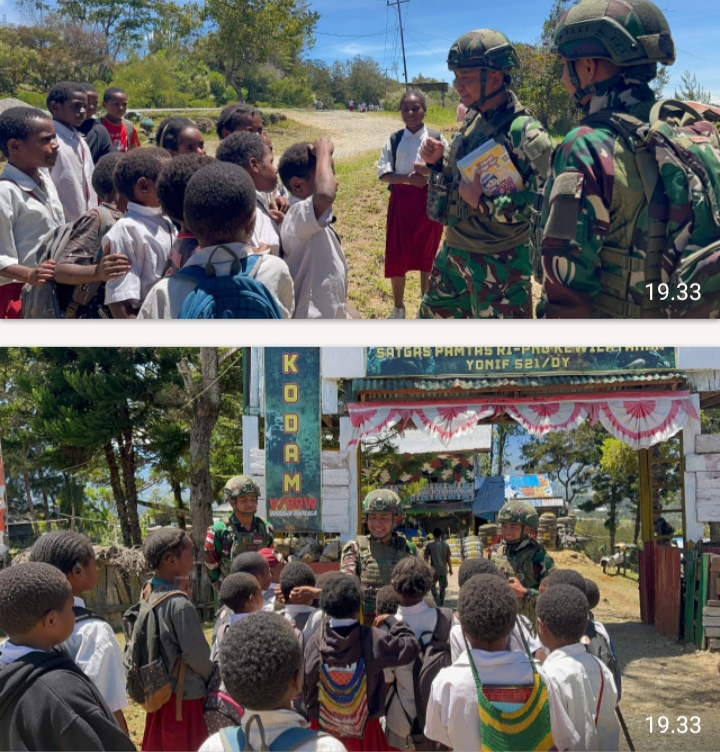 Dalam rangka meningkatkan minat baca serta mendukung pendidikan anak-anak di wilayah penugasan, Satgas Yonif 521/DY melaksanakan kegiatan pembinaan teritorial (Binter) dengan membagikan buku kepada anak-anak di Distrik Napua, Kabupaten Jayawijaya, Papua Pegunungan. (16/4/2026).