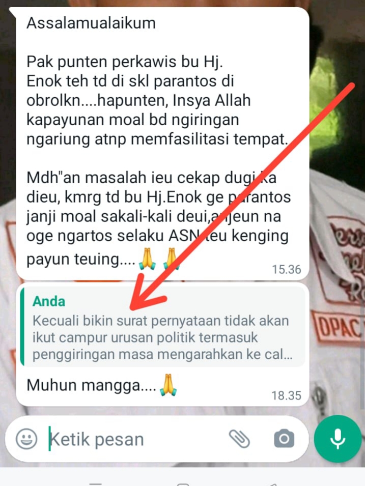 Diduga kuat telah melanggar peraturan Bawaslu. ASN – TNI – POLRI PEJABAT BUMN / BUMD KETUA RT, KETUA LINGKUNGAN, LURAH & CAMAT TERLIBAT POLITIK PRAKTIS DIPIDANA PENJARA Terterah Di UU NO 7 TAHUN 2017 PASAL 280 ( ATAT 2 3) PASAL 282 PASAL 283( AYAT 1.2) DAN UU NO 10 TAHUN 2016 PASAL 70.