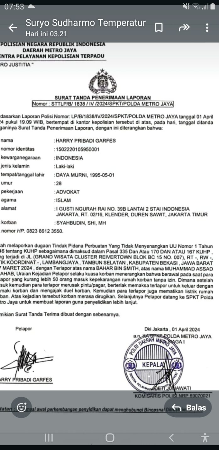 “Parahnya lagi ada sekelompok puluhan orang yang menyerang rumah klien kami dengan tuduhan dan fitnah yang dibiarkan masuk ke Cluster Rivertown seolah-olah membiarkan penyerangan ke rumah klien saya pada bulan Ramadhan 2024 lalu, dengan sengaja oknum RT Fajarullah memfitnah tanpa dasar kepada klien kami di muka umum dan perbuatan tersebut sudah kami laporkan ke Poda Metro Jaya dengan Nomor: STTPLB/B/1838/IV/2024/SP/POLDA METRO JAYA.