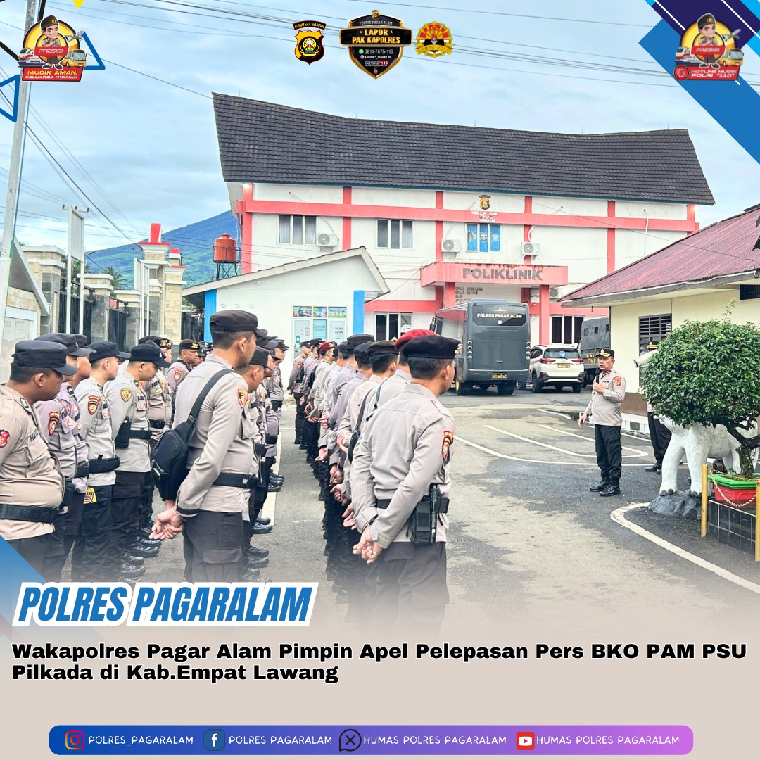 HumasRes Pagaralam -sumsel Pada hari Kamis, 17 April 2025 pukul 06.30 WIB, telah dilaksanakan apel pelepasan personel Polres Pagar Alam yang dipimpin langsung oleh Wakapolres Pagar Alam, Kompol M. Ali Asri, SH. Kegiatan ini berlangsung di halaman Mapolsek Pagaralam Utara dalam rangka memberikan bantuan pengamanan pada pelaksanaan pemungutan suara ulang (PSU) Pilkada damai di wilayah Polres Empat Lawang, Personel Polres Pagar Alam yang melaksanakan BKO sebanyak 65 orang personel yang dipimpin oleh Kasat Samapta Akp Saldi Jaya,SH Tmt 17 april 2025 sampai dengan 2025.