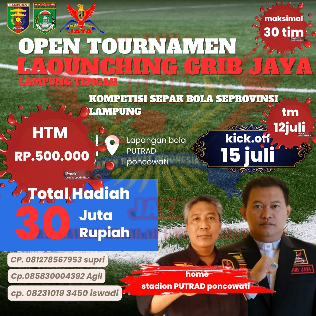 Dewan Pimpinan Daerah (DPD) GRIB Jaya Lampung menggelar turnamen sepak bola bertajuk GRIB Jaya Open Cup Football 2025 yang berlangsung di Lapangan Trans-AD Kampung Poncowati, Kecamatan Terbanggi Besar.