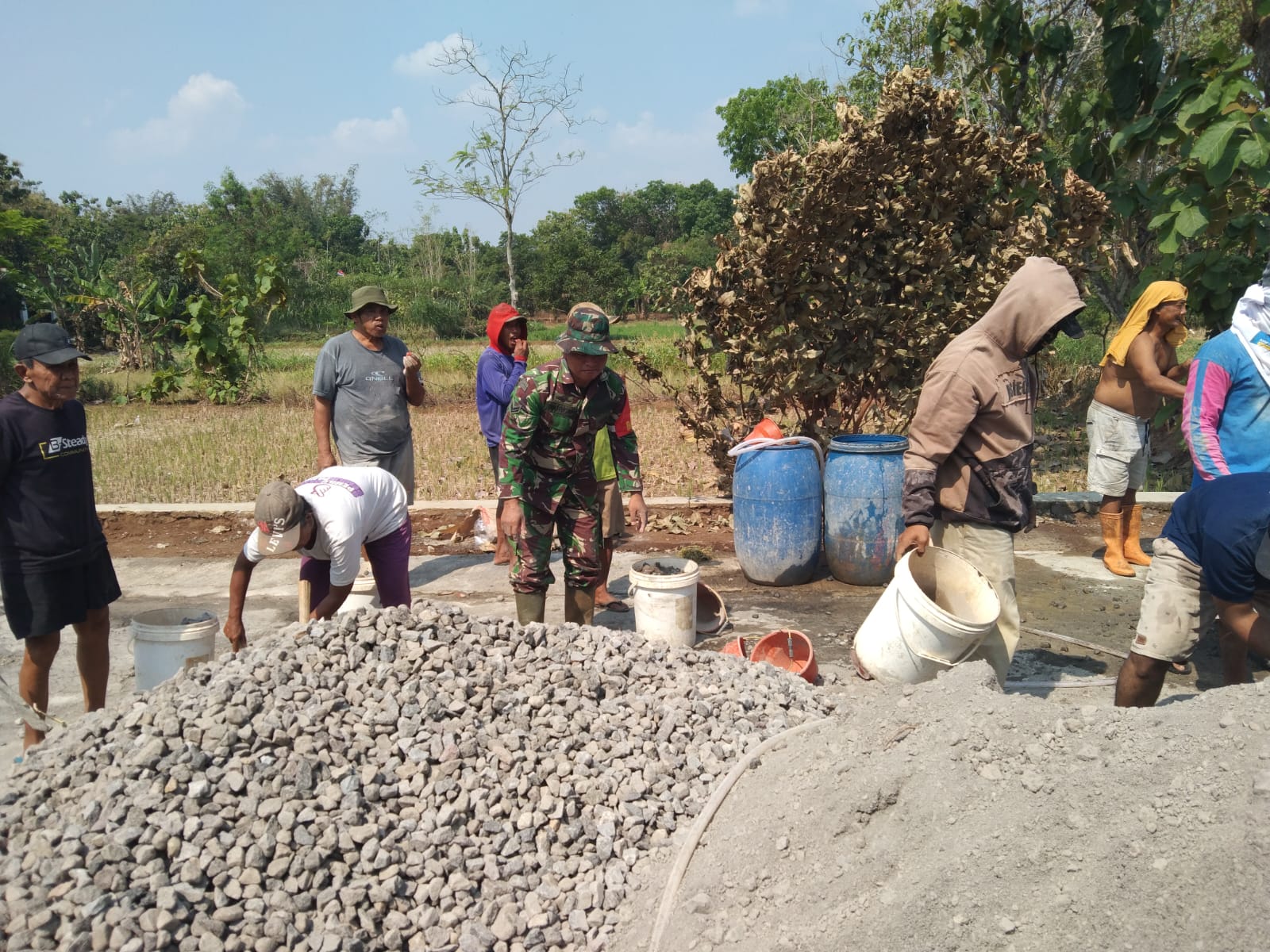 Dengan penuh semangat, Serka Wahyono tak ragu ikut mengangkat pasir dan memasukkannya ke mesin molen bersama masyarakat. Aksi itu menjadi teladan nyata bahwa seorang Babinsa harus selalu hadir dan menjadi penggerak dalam setiap kegiatan kemasyarakatan.