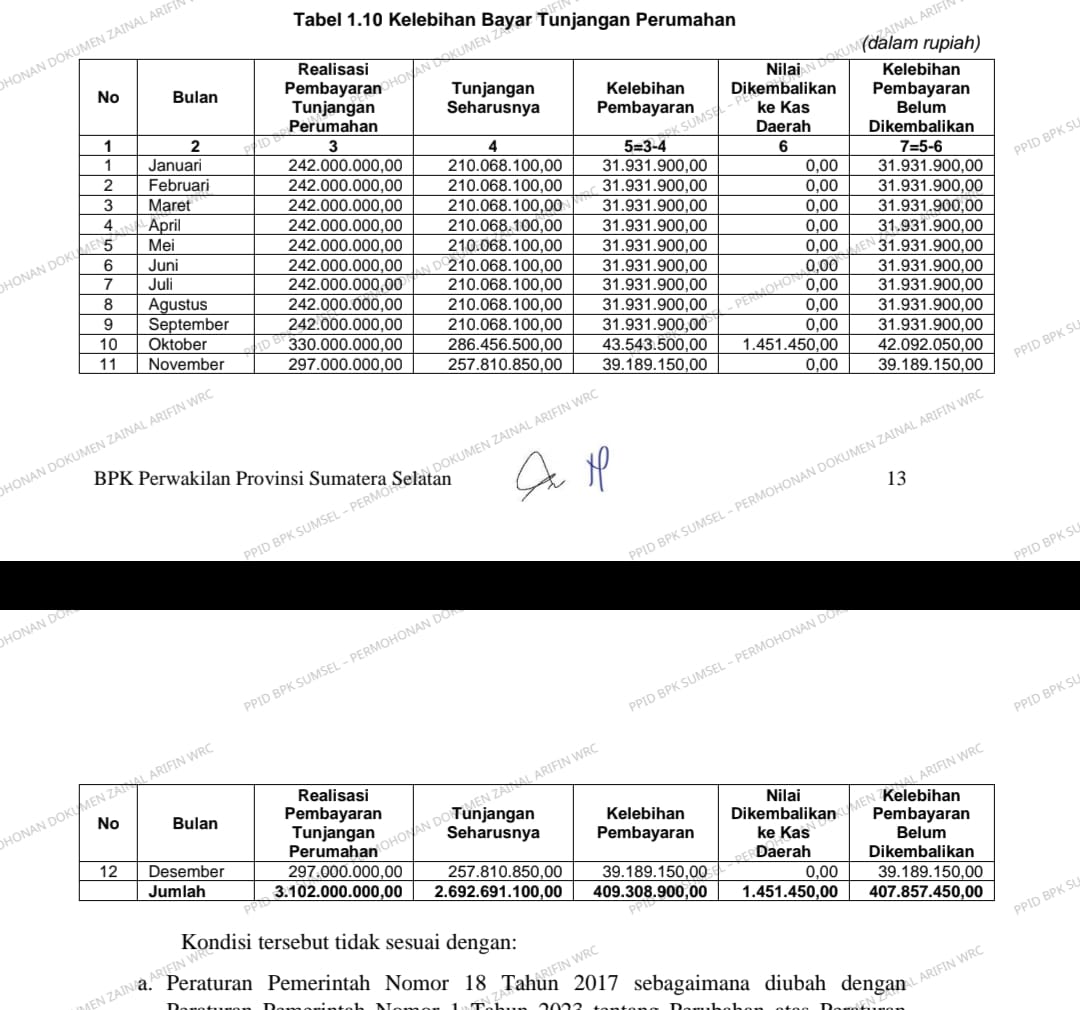 kelebihan pembayaran Tunjangan Perumahan Tahun 2024 sebesar Rp409.308.900,00