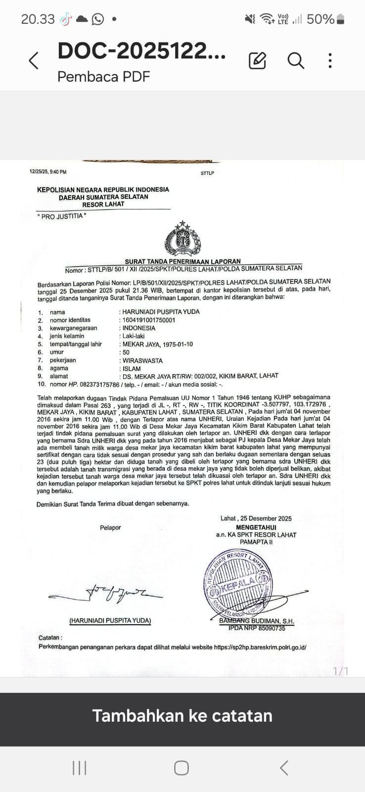 Bau anyir kasus dugaan pemalsuan tanah di Desa Mekar Jaya, Kikim Barat, Lahat, Sumatera Selatan, kian menyesakkan dada. Haruniadi Puspita Yuda, seorang warga yang berani angkat bicara, telah melaporkan dugaan kejahatan sistematis ini ke Polres Lahat pada 25 Desember 2025. Laporan ini bukan sekadar lembaran kertas, melainkan jeritan pilu dari masyarakat yang haknya dirampas secara brutal oleh oknum penguasa.